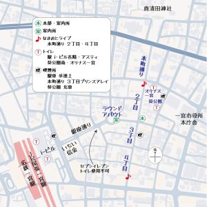 1)搬入:近隣からステージ横へ楽器等を搬入【音響担当に声掛けお願い】(会場の本町通りは9時から20時まで車両通行止め)上記マップ参照