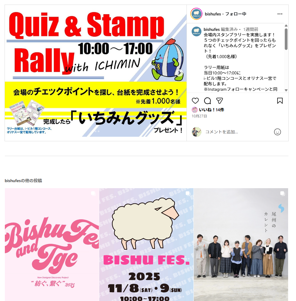 TOP NEWS NEWS 2025.11.06 クイズ&スタンプラリー開催…BISHU FES.会場各地で BISHU FES.会場各地を経めぐる、クイズ&スタンプラリーが開催されます! BISHU FES.… 2025.11.05 「まちの保健室」さんが来てくれて、BISHU FES.marcheは安全安心 BISHU FES.marcheは安全安心です!まちの保健室さんが来てくれます! 「まちの保健室… 2025.09.27 2025.11.8・9 出展ブース(BISHU marche +クラフトビアパーティ) 2025年11月8日(土)9日(日)開催「BISHU FES.marcheⅢ + クラフトビアパーティⅩ」の出… 2025.09.23 2025.11.8・9 なまおとライブ(BISHU FES.marche +クラフトビアパーティ) 2025年11月8日(土)9日(日)開催「BISHU FES.marcheⅢ + クラフトビアパーティⅩ」のラ… 2025.09.17 ポスター・フライヤーできました!BISHU FES.marche Ⅲ 2025年11月8日(土)・9日(日)、尾張一宮・名鉄一宮駅近くで開催される「BISHU FES.mar… 2025.09.04 速報! BISHU FES.marche Ⅲ + クラフトビアパーティX 当ページの内容は以前のものです。下記総合案内ページをご覧ください。⇒ 2025.11.8・… 2025.09.03 BISHU FES.marche、クラフトビアパーティのボランティア募集! 衣・食・住のクラフト文化を一宮から伝えていく下記のイベントで、ボランティアスタ… 2025.07.03 BISHU FES. marcheⅢ & クラフトビアパーティⅩ「なまおとミニライブ」…出演者募集 第3回 BISHU FES. 開催 「BISHU FES.marche」の本体となる「BISHU FES.」が開催され… 2024.10.11 トイレマップ…2024.10.12・13 BISHU FES.marche+まちの宮市 これは2024年10月のものです。最新情報をご確認ください。 2024年10月12日(土)・13日… 1 2 … 4 > カテゴリー お知らせ (35) ステージ出演者の方へ (16) ブース出展者の方へ (23) BISHU FES. (11) イベント (1) ライブ (4) グッズ (6) 業務連絡~スタッフの皆さんへ (2) アーカイブ・アルバム (2) スタッフ・ボランティア (1) 広報 (1)