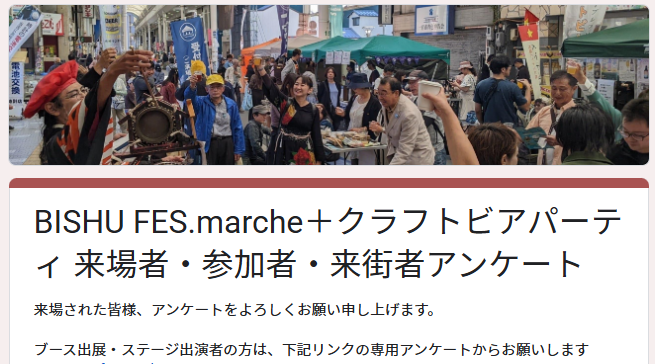 TOP NEWS NEWS 2025.11.12 BISHU FES.marcheⅢ + クラフトビアパーティⅩ 開催御礼 2025年11月8日(土)・9日(日)と、一宮市銀座通り・本町通り一帯にて「第3回BISHU FES.… 2025.09.21 2025.11.8・9 BISHU FES.marche Ⅲ 総合案内 (クラフトビアパーティも) 直前ご案内(天候対応など) ⇒ 直前ご案内(天候対応など):クラフトビアパーティⅩ +… 2025.11.09 アンケートよろしくお願い申し上げます…BISHU FES.marche・クラフトビアパーティ 2025年11月8日(土)・9日(日)の「BISHU FES.marcheⅢ + クラフトビアパーティⅩ」を、… 2025.11.09 アメニモマケズ…BISHU FES.marcheⅢ + クラフトビアパーティⅩ 2025年11月9日(日)、2日目のクラフトビアパーティⅩ+BISHU FES.marcheⅢは残念ながら… 2025.11.07 直前ご案内(天候対応など):クラフトビアパーティⅩ + BISHU FES.marche Ⅲ 2025年11月8日(土) 9日(日)、いよいよ明日から2日間、第10回クラフトビアパーティ・… 2025.11.06 クイズ&スタンプラリー開催…BISHU FES.会場各地で BISHU FES.会場各地を経めぐる、クイズ&スタンプラリーが開催されます! BISHU FES.… 2025.11.05 「まちの保健室」さんが来てくれて、BISHU FES.marcheは安全安心 BISHU FES.marcheは安全安心です!まちの保健室さんが来てくれます! 「まちの保健室… 2025.10.31 トイレマップ・分煙マップ…2025.11.8・9 BISHU FES.marcheⅢ + クラフトビアパーティⅩ 2025年11月8日(土)9日(日)のマップです。 オリナス一宮内のトイレは使わないでくださ… 2025.10.30 パンフレット、できてきました!BISHU FES.marche Ⅲ + クラフトビアパーティⅩ 2025年11月8日(土) 9日(日)に一宮市東口駅近くでコラボ開催される「BISHU FES.marche… 投稿のページ送り 1 2 … 9 > カテゴリー お知らせ (38) ステージ出演者の方へ (18) ブース出展者の方へ (25) BISHU FES. (11) イベント (1) ライブ (4) グッズ (6) 業務連絡~スタッフの皆さんへ (2) アーカイブ・アルバム (2) スタッフ・ボランティア (1) 広報 (1)